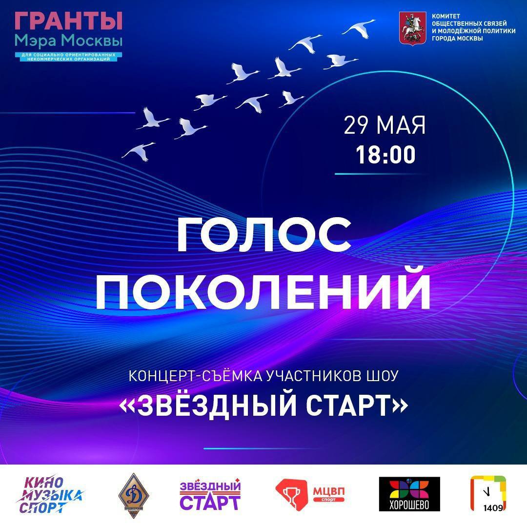 Приглашаем вас 29 мая в 18:00 во дворец творчества детей и молодежи «Хорошево» на концерт «Голос поколений», посвященный 80-летию Великой Победы. Мероприятие проходит в рамках проекта «Звёздный старт», реализуемого при поддержке грантов Мэра Москвы.